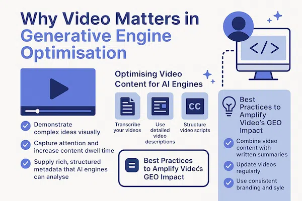 Brief Overview: This article dives into the evolving role of video content in GEO strategies, explaining how well-produced video assets can increase your brand’s visibility in generative AI responses. It also provides insights on how to optimise videos for AI engines beyond traditional video SEO. Why Video Matters in Generative Engine Optimisation Video content is...